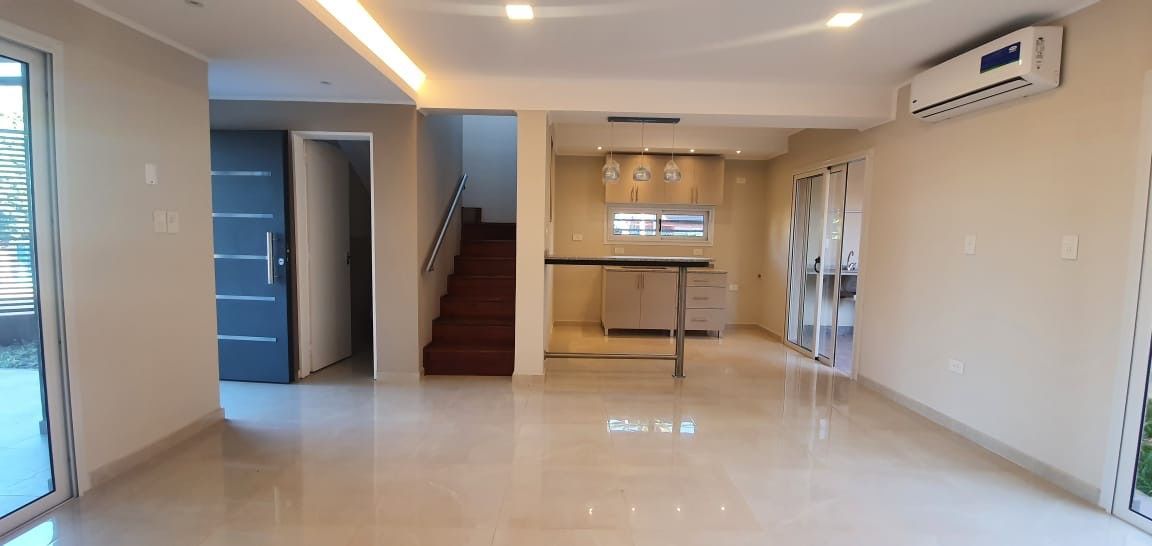 En planta baja se encuentra un amplio living-comedor integrado con la cocina, completamente amoblada con alacenas y bajo mesada con cajoneras, además de un desayunador de granito. Desde el área social se accede al patio con quincho y parrilla, ideal para reuniones y momentos al aire libre. También dispone de lavadero cubierto, jardín y cochera cubierta con portón automatizado.
